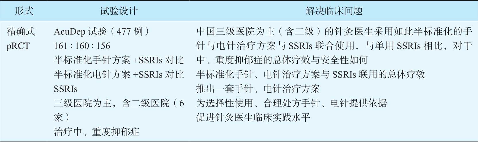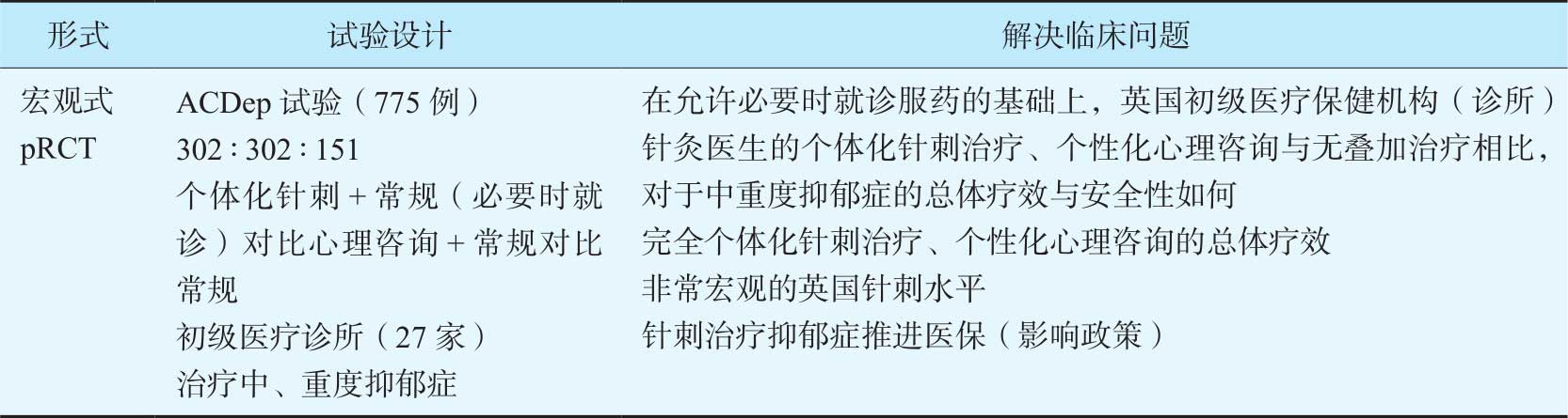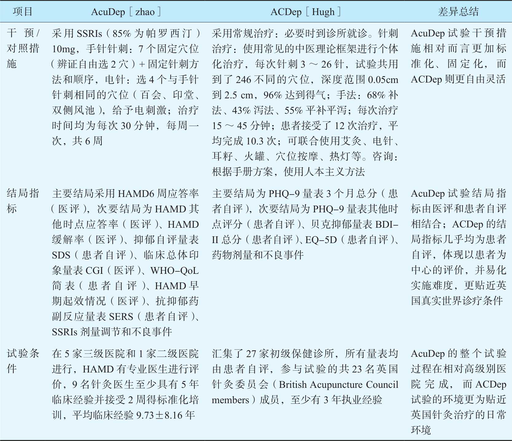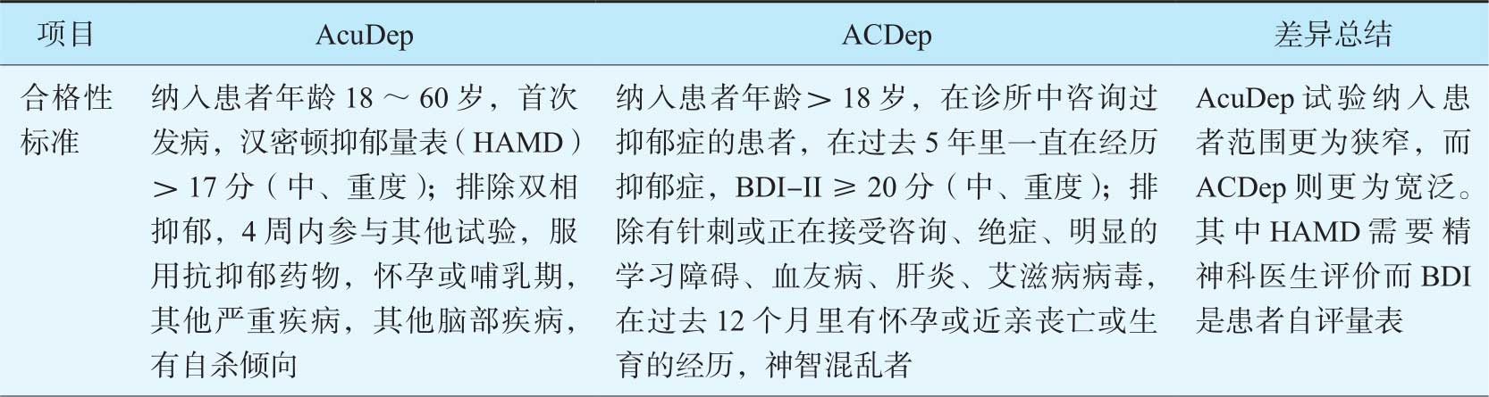 以中国研究《手针或电针加载5-羟色胺再摄取抑制(SSRIs)治疗抑郁症患者随机对照试验》( Manual or electroacupuncture as an add-on therapy to SSRIs for depression:A randomized controlled trial ,AcuDep)为例,并对比英国临床研究《针灸和咨询在初级保健中治疗抑郁症:一项随机对照试验》( Acupuncture and counselling for Depression in Primary Care:A Randomized Controlled trial ,ACDep),进行精确式pRCT和宏观式pRCT对比(表3-5)。