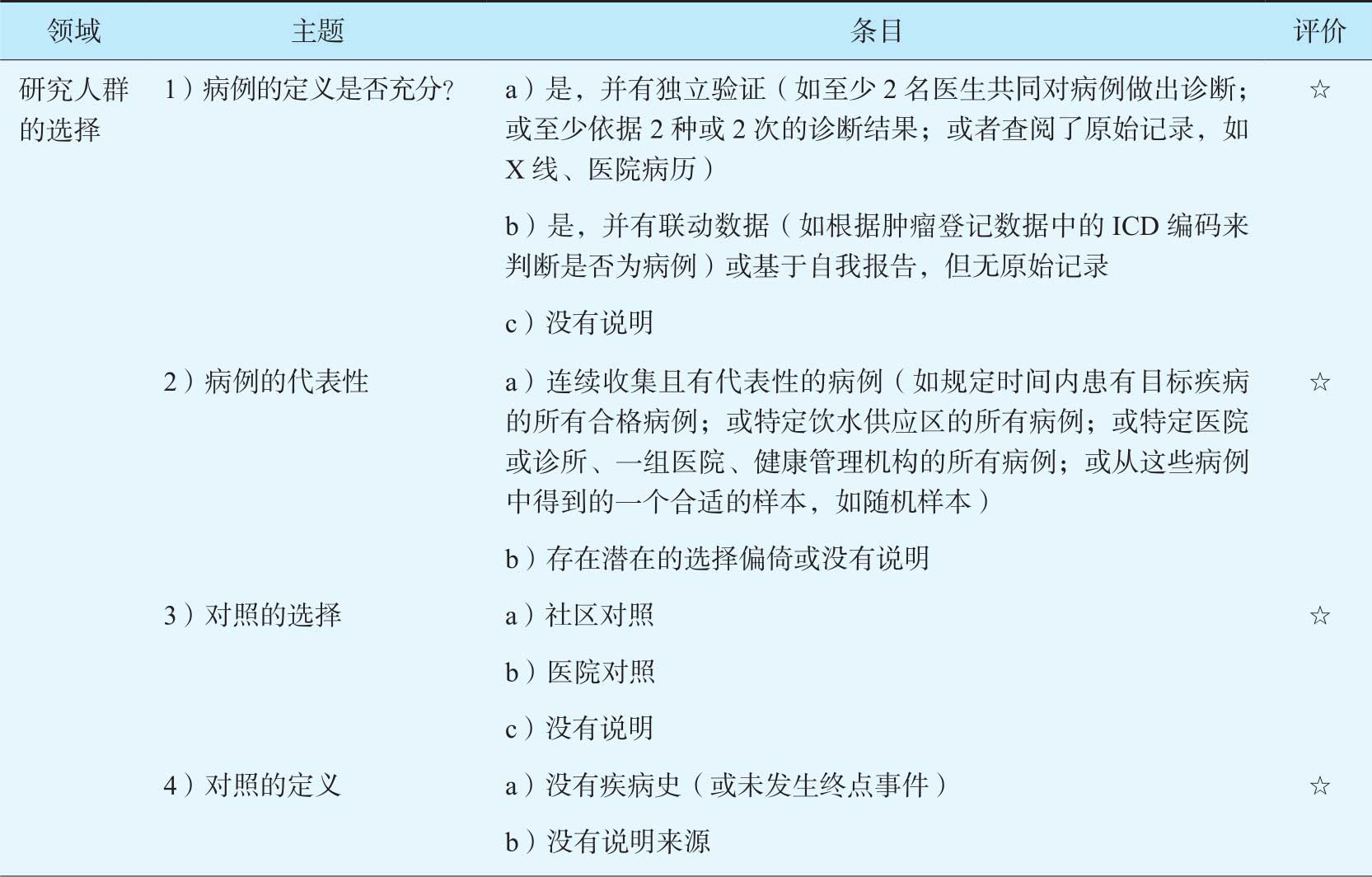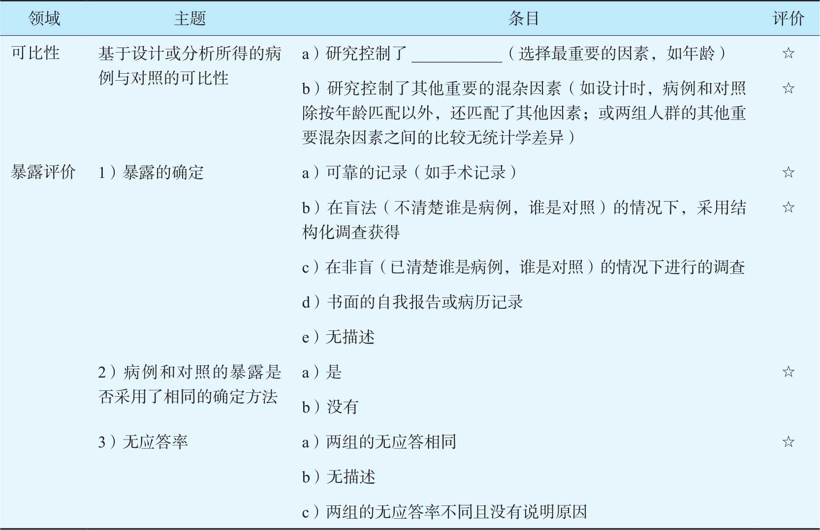NOS量表通过3个维度共8个条目的方法评价病例对照研究,具体包括研究人群的选择、可比性和暴露评价。NOS对研究质量的评价采用了星级系统的半量化原则,满分为9颗星。NOS有自己专门的网站(http://www.ohri.ca/programs/clinical_epidemiology/oxford.asp),提供了量表的“.doc”及“.pdf”版本,可免费下载。NOS量表如表5-1所示。