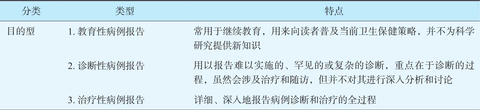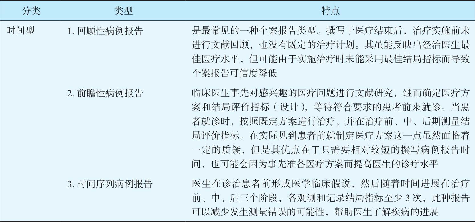 依据目的的不同,个案报告可分为教育性病例报告、诊断性病例报告及治疗性病例报告;按照时间的不同,个案报告可以分为回顾性病例报告、前瞻性病例报告及时间序列病例报告。随着循证医学的发展,除以上两种分类外,循证个案报告(evidencebased case report)也随之出现,循证个案报告是对临床研究证据应用于单个患者进行的临床医疗过程及其结果的报告。不同类型的个案报告各具特点(表7-1)。