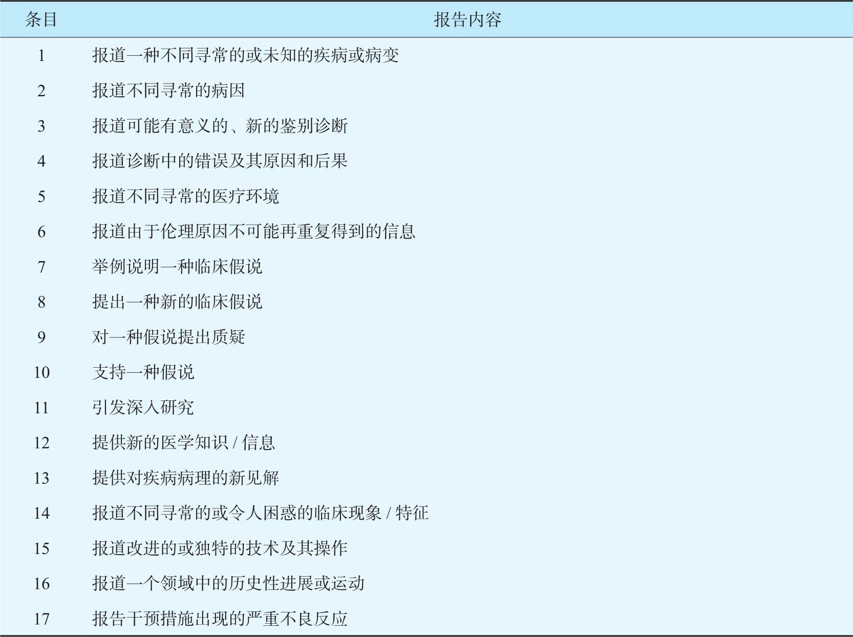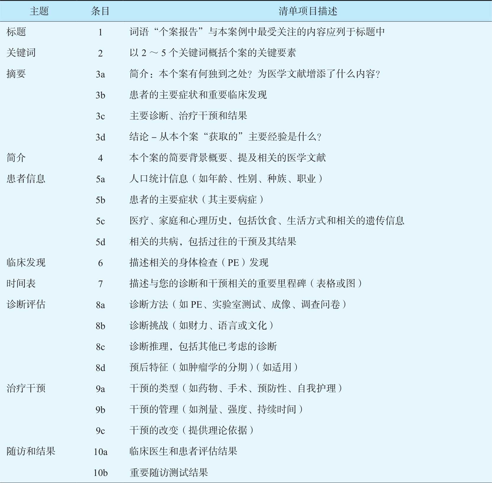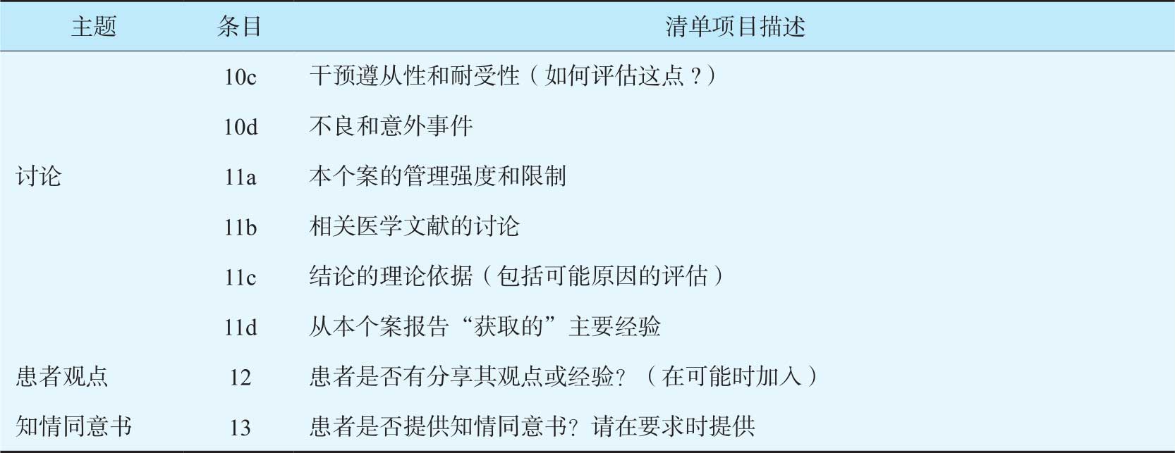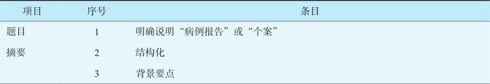 2013年发表的国际临床个案报告规范(CARE)被视为国际公认的报告规范(表7-3)。一般情况,国外医学期刊发表的个案报告不仅要依据CARE信息清单,还要注意病例报告的适用范围(表7-4)。
