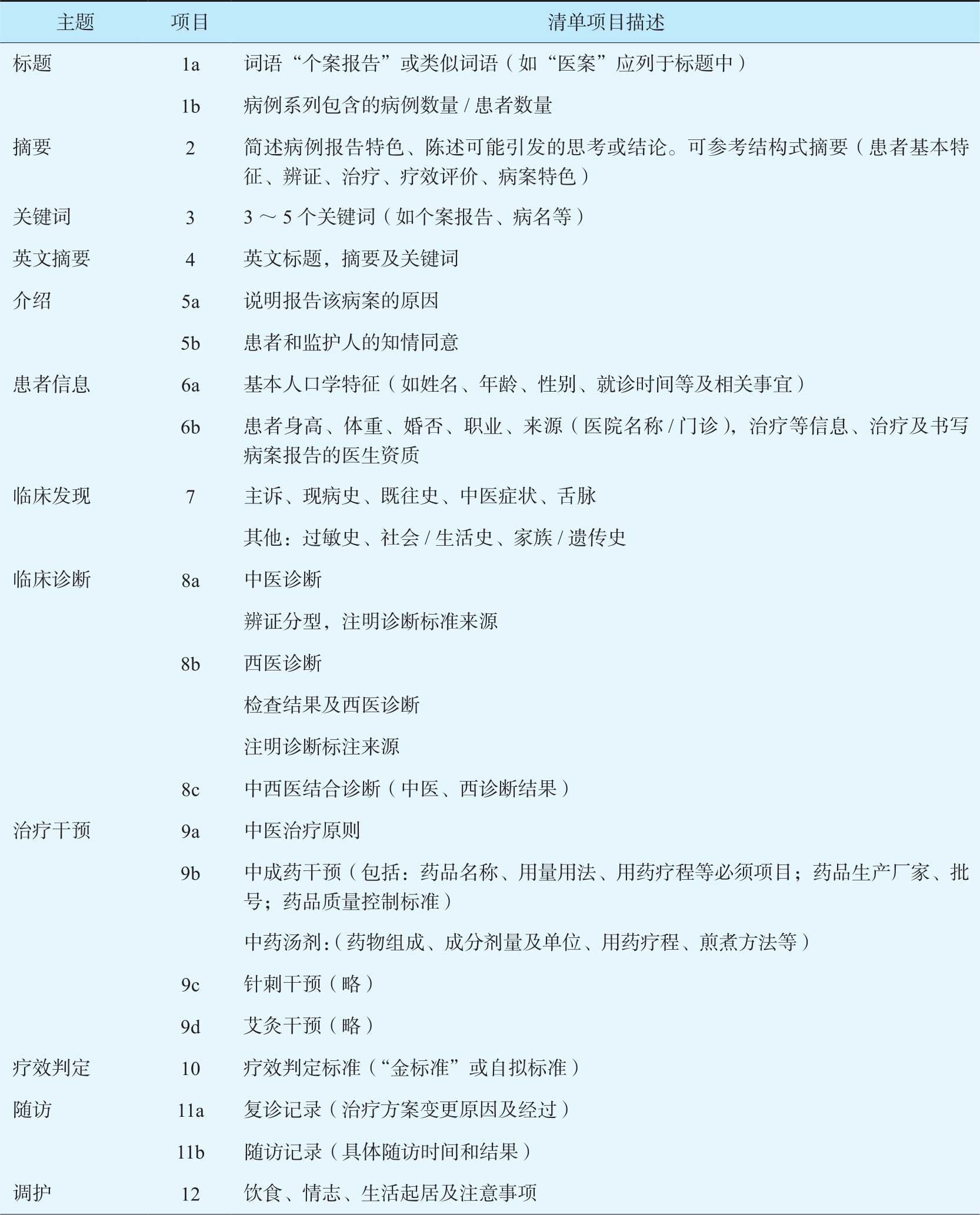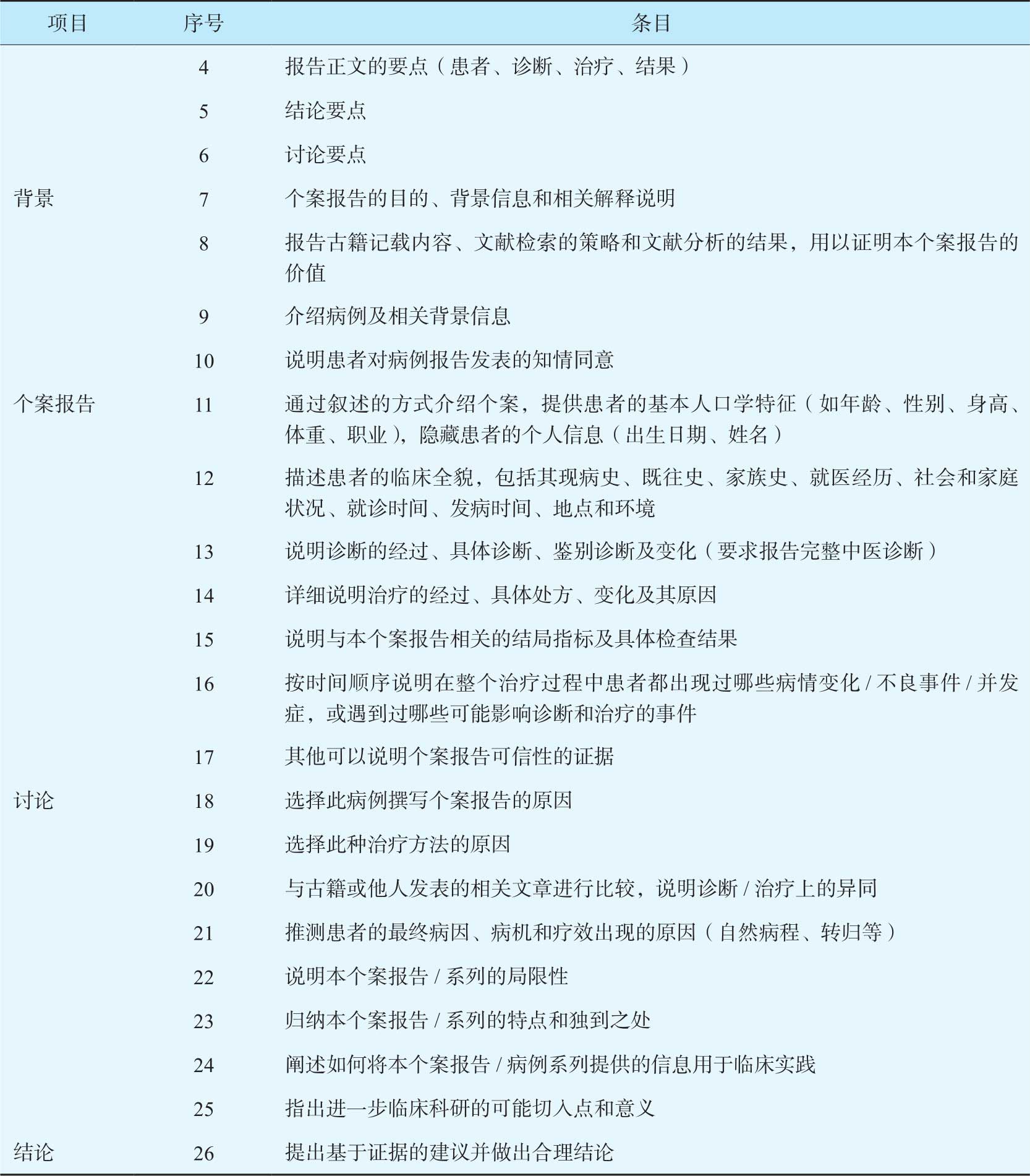 以上建议条目为今后中医师撰写病例报告及投稿前自我评估提供参考,也可用于已发表病例报告进行定性的质量评价时参考使用。