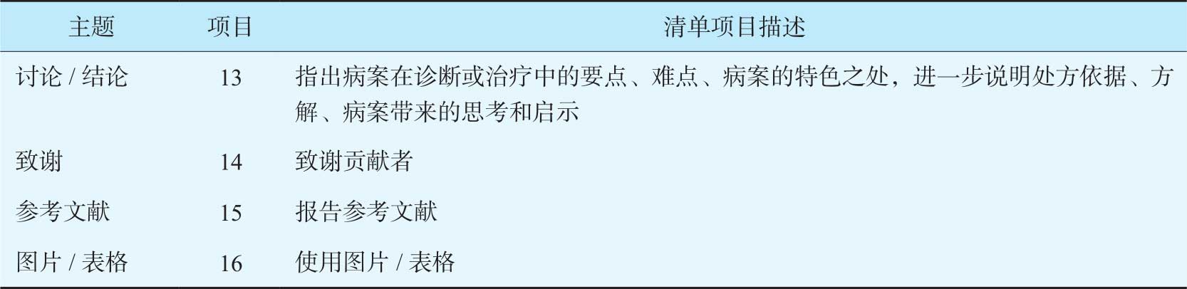 有研究表明,自2006年起,中医个案报告类论文发表数量逐年上升,至2012年、2013年达到高峰。2013年起,香港浸会大学卞兆祥等学者在系统审查已发表的中医病例报告时发现,中医病例报告质量不甚理想,不少病例报告的内容存在随意性和不完整性,不同病例报告撰写格式也有很大差异。他们与中医临床专家、方法学专家、医学期刊编辑等多学科专家学者共同制定了中医病案报告(consensus-based recommendations for case report in Chinese medicine,CARC)标准,并于2016年在《中国结合医学杂志》上正式发表。CARC以传统中医经验传承和个体化辨证论治为原则,运用流行病学及循证医学的调研和共识方法制定,主要包含16个条目(表7-5)。