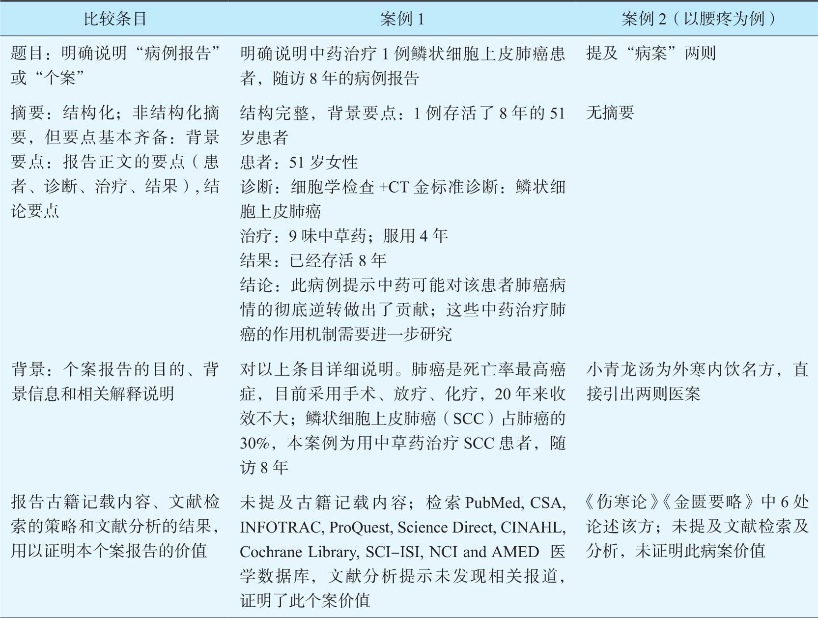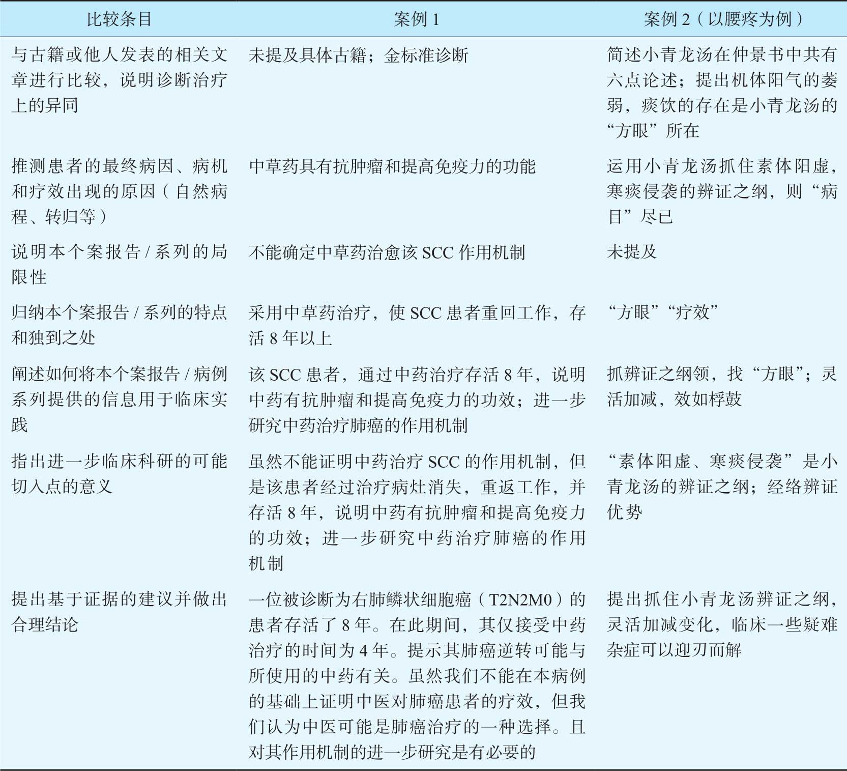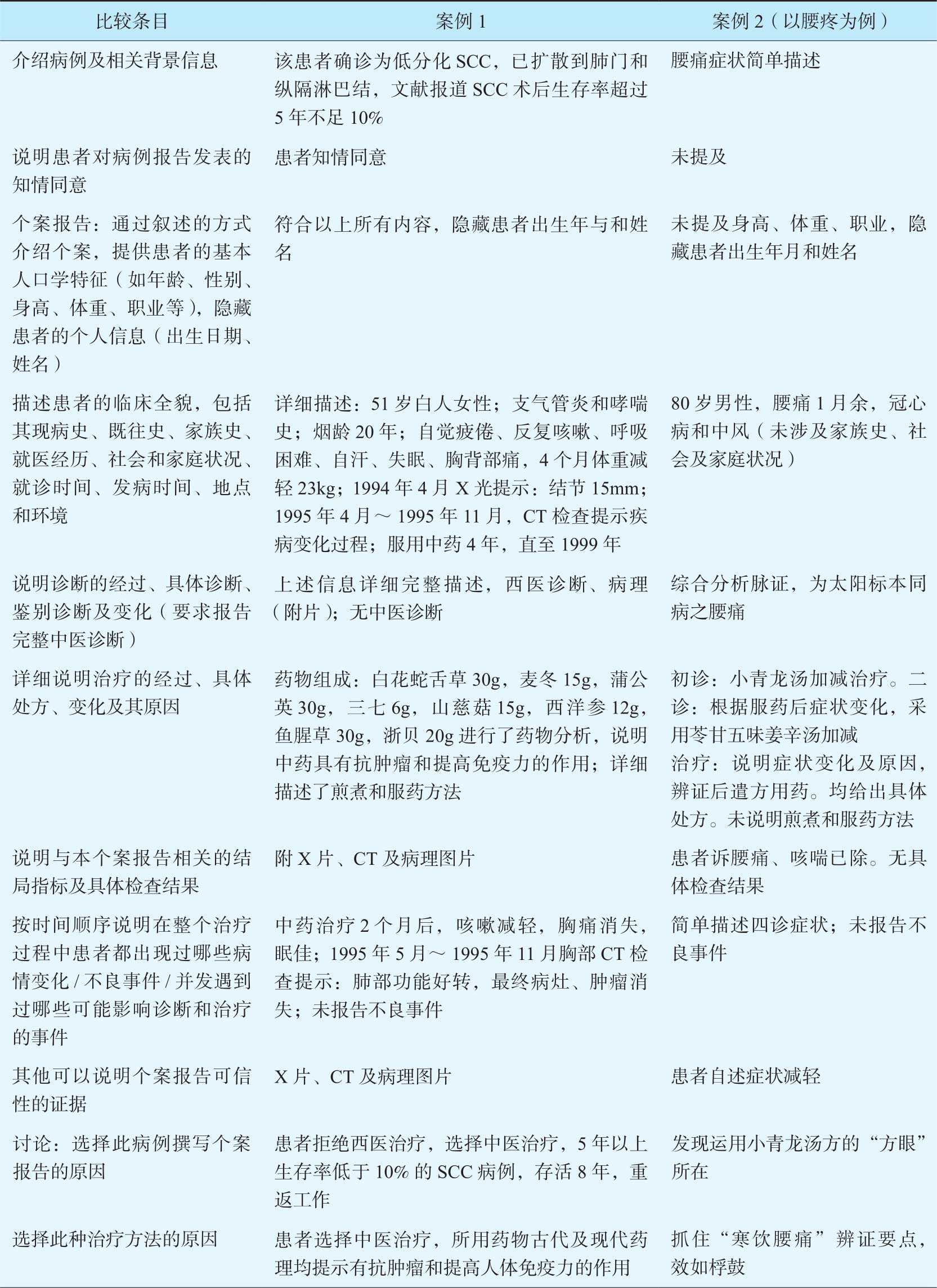 下面我们以发表在 Lung Cancer 的题为“Regression of squamous cell carcinoma of the lung by Chinese herbal medicine:a case with an 8-year follow-up”(简称:病例1)和“从两则病案谈运用小青龙汤的体会”(简称:病例2)两篇文章作为对比,参考“中医个案报告建议条目”进行如下比较分析,以期提供有益的参考,见表7-6。