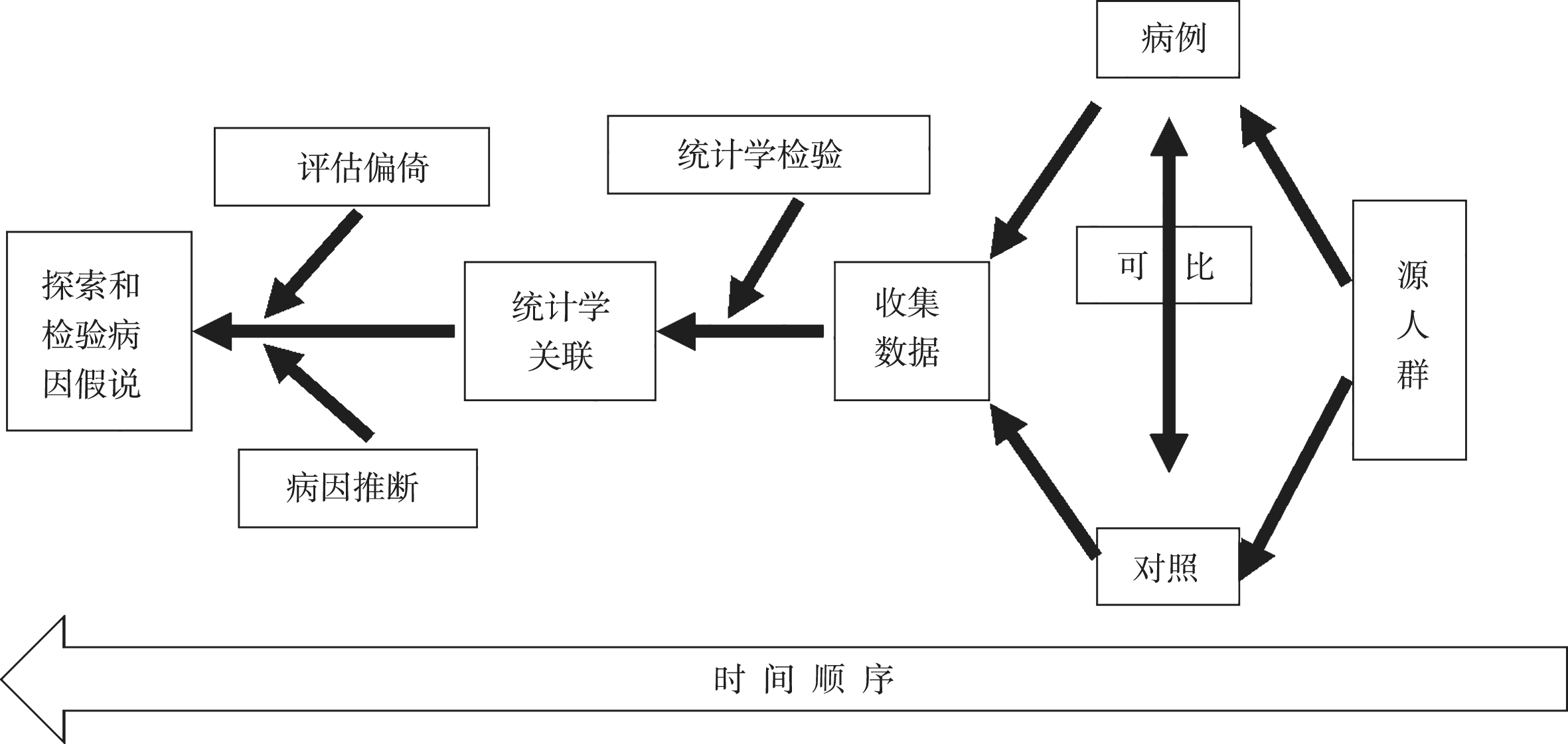 (1)在病例对照研究中,暴露和结局是存在时间间隔的,在确定病例组和对照组后,需要在时间上追溯既往暴露情况,即先确定结果,然后再向之前寻找原因;