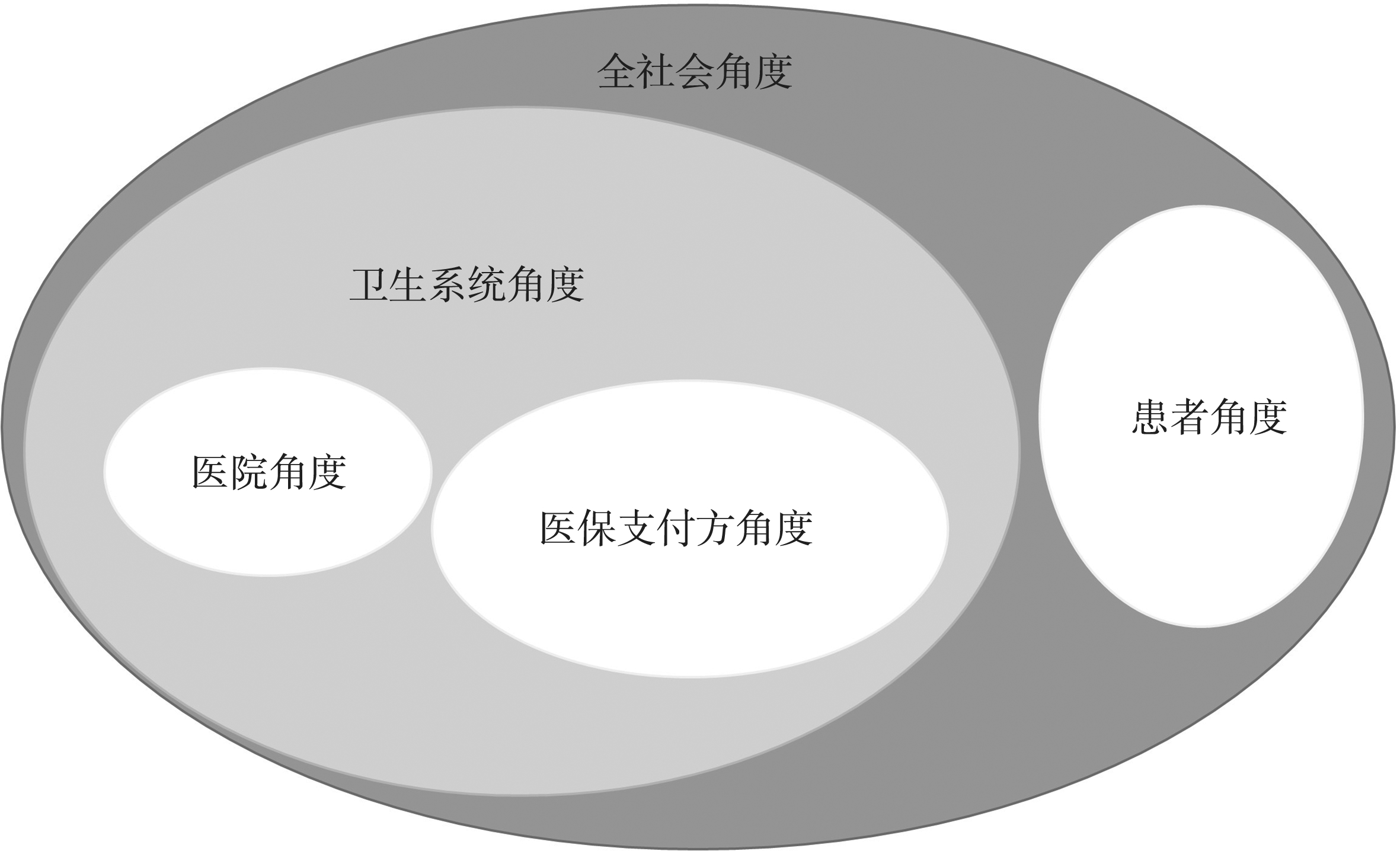 根据所服务的决策主体不同,卫生经济学评价的研究角度也有所不同。从大到小,卫生经济学评价的主要研究角度可大致分为:全社会角度、卫生系统角度、医保支付方角度、医院角度以及患者角度等,各研究角度之间的关系见图9-1。