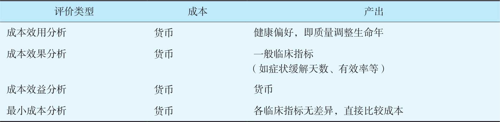 根据衡量健康产出所用的指标不同,卫生经济学评价主要可以分为以下四种类型:成本-效果分析(Cost-effectiveness analysis,CEA),成本效用分析(Cost-utility analysis,CUA),成本效益分析(Cost-benefit analysis,CBA),以及最小成本分析(Cost minimization analysis,CMA),见表9-1。此外还有国内较少使用的风险-效益分析(Risk-Benefit Analysis)和成本-后果分析(Cost-consequence Analysis)等。