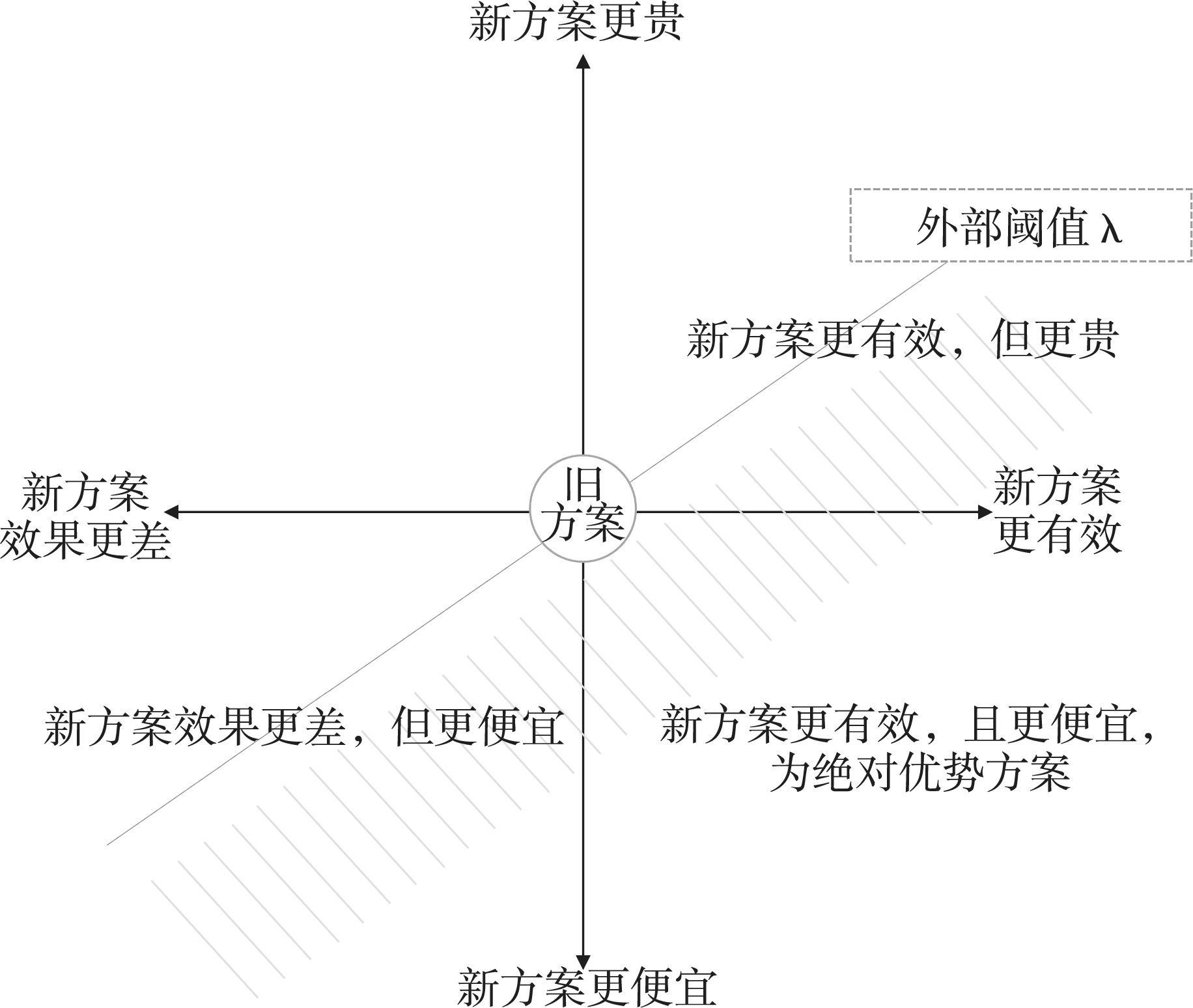 对于上述干预措施经济与否的判定过程,还可以采用成本效果平面的方式进行解读。图9.2中,原点代表的是旧方案(对照方案),横轴两个方向分别代表新方案(目标干预措施)更加有效或效果更差,纵轴的两个方向分别代表新方案比旧方案成本更高或成本更低。如前面讲到的,这里的成本指的是经济学评价中某研究角度下,所有与因患病而接受某种干预措施的所有成本,不是单纯的药品或干预措施的价格。斜穿原点的斜线是外部阈值,当新方案与旧方案的增量成本效果比值在成本效果平面上的位置位于该阈值线之下,即图9-2中的阴影部分,则可以认为新方案比旧方案更加经济。