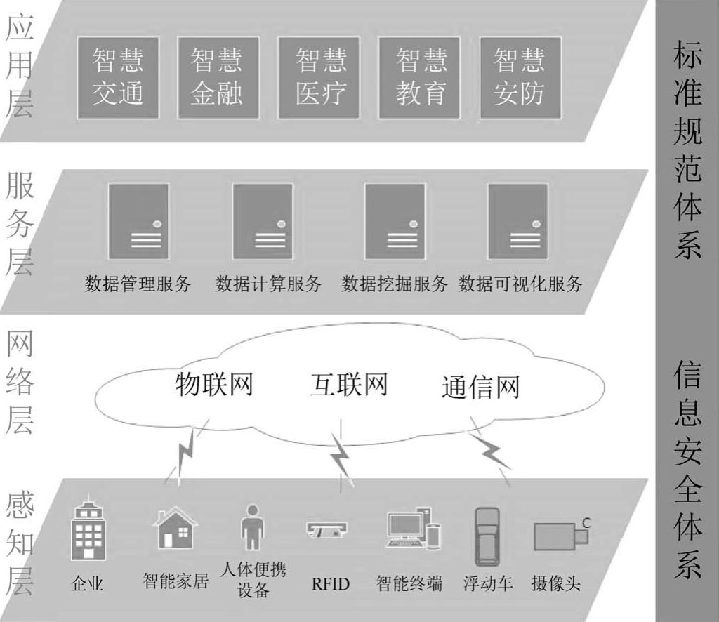 智慧城市整体的体系架构如图1.1所示,该架构将智慧城市由下到上分成了4层,分别是感知层、网络层、服务层和应用层,同时两大保障体系(包括标准规范体系和信息安全体系)贯穿了这4个层次。