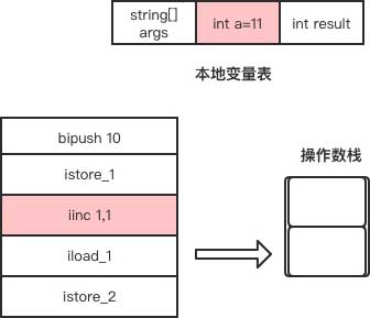3.iinc这条字节码指令比较特别,它可以直接操作局部变量表的变量,而不需要经过操作数栈。该指令是将局部变量表中索引为1的Slot所存储的整数值自增1,也就是将局部变量a自增1。如图1.12所示。