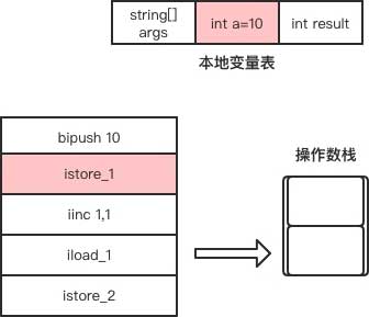 2.istore_1指令是将操作数栈顶的元素从操作数栈出弹出,并存放到局部变量表中索引为1的Slot,也就是赋值给变量a。如图1.11所示。