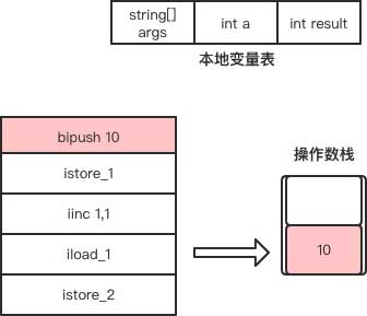 1.bipush指令是将立即数10放入到操作数栈顶,如图1.10所示。
