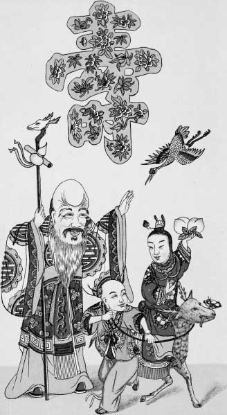 这个被崇拜为神仙的寿星,长脑袋,短身躯,白胡子,手持龙头拐杖,或捧仙桃,身边常有蝙蝠或鹿围绕—构成福、禄、寿一套吉祥之物,是很讨人喜欢的。假如到西洋去找个类似的老头儿,那么,圣诞老人也许可以同他媲美。