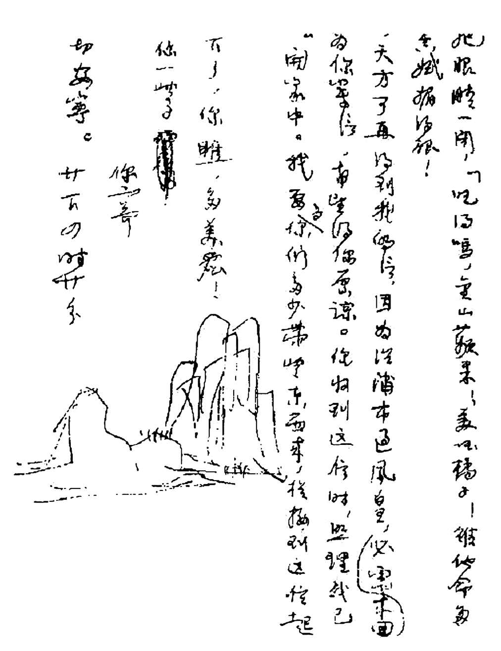 山水美得很,我想你一同来坐在舱里,从窗口望那点紫色的小山。我想让一个木筏使你惊讶,因为那木筏上面还种菜!我想要你来使我的手暖和一些……