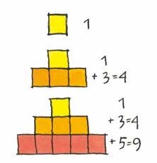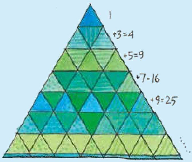 建塔的时候,你还可以用三角形代替正方形(记得要选择边长一样的正三角形)。第一层画1个三角形;第二层画3个,总共是4个;第三层画5个,总共是9个……以此类推,想想看,最后会出现一个怎样的图形?