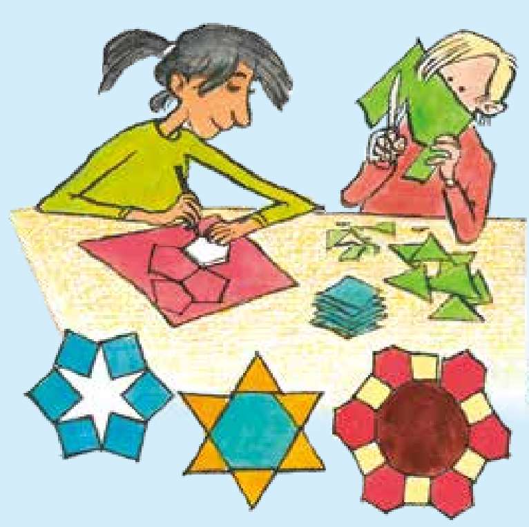 本书最后附有正多边形的模板,可用复印机进行缩放和复印。剪下模板,在彩纸上描出轮廓,分别裁开。(用硬纸板做出的正多边形更结实。)