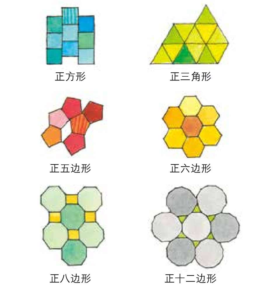 这些正多边形里,有一些可以实现单独密铺。比如正方形、正三角形和正六边形,它们能够完美地拼接在一起,严丝合缝。