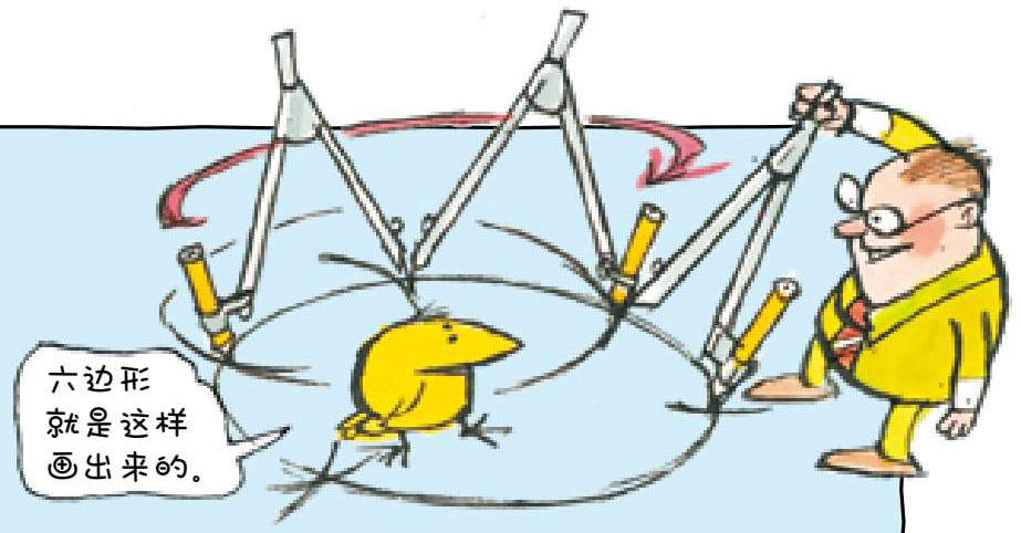 用圆规画一个圆。圆规两脚间的距离即为半径,保持这一距离不变,刚好能在圆周上均等地画出6个点。也就是说,无论圆的大小如何,总能利用圆规对圆周进行六等分,相邻两点间的弦长(连接圆上任意两点的线段叫作弦)等于半径。