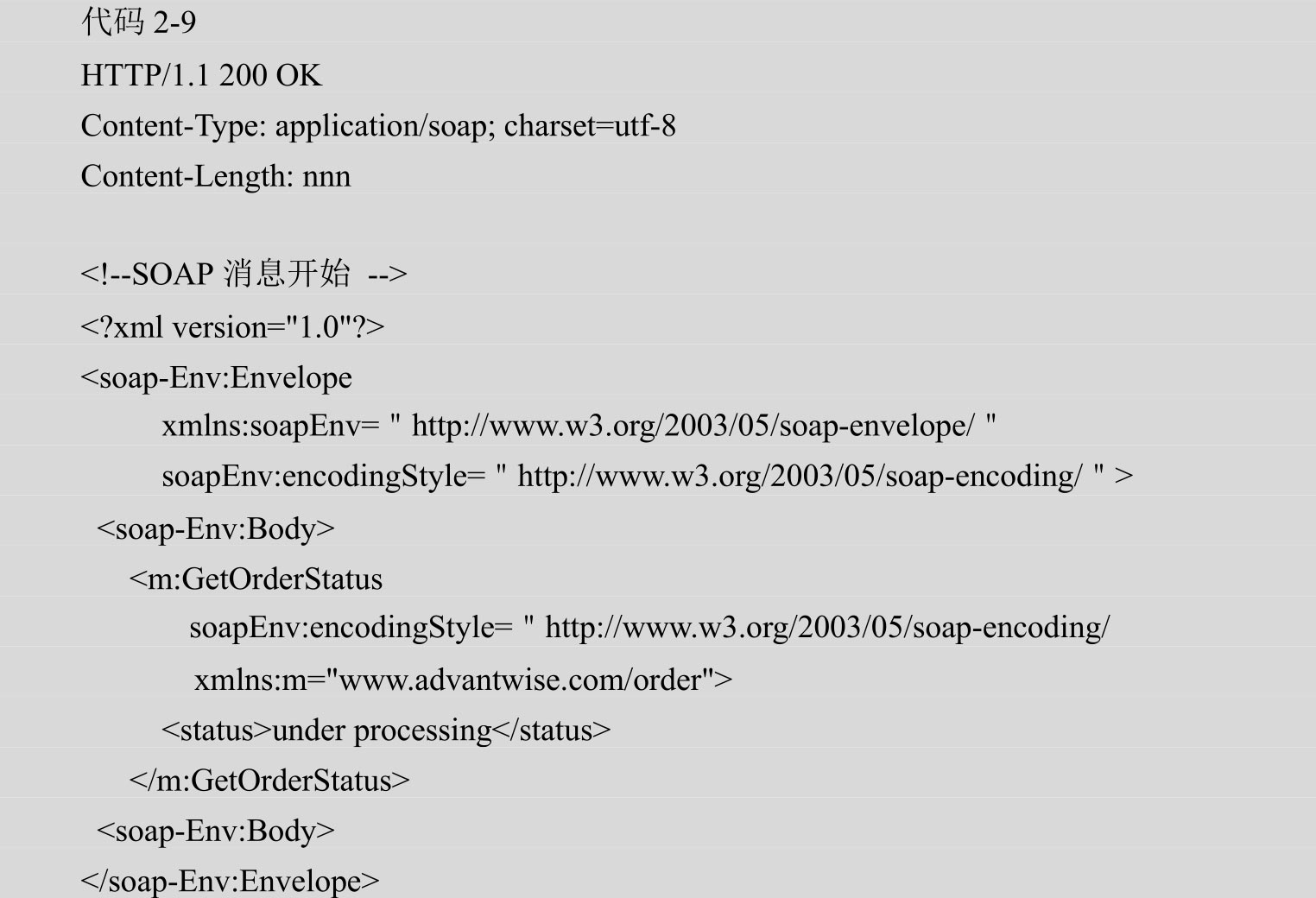 代码2-9的第一行包含了状态码(200)及与状态码相关联的信息(OK)。SOAP HTTP完全遵循HTTP状态码的语法,主要包括如下几种状态码。
