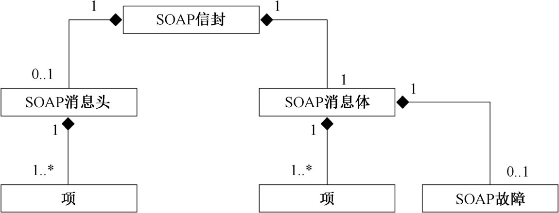 SOAP消息结构的基本模型如图2-3所示:整个SOAP消息包含在一个信封中,信封内有一个SOAP消息头和一个SOAP消息体,其中SOAP消息头是可选的,消息头和消息体可以包含多个条目,SOAP消息体可以包含SOAP故障。