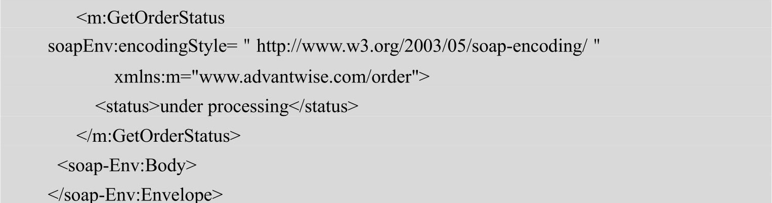 (1)成功状态码。2XX HTTP成功状态码用来说明SOAP请求消息已经被接收或被成功处理。其中,200 OK表示请求消息被成功接收,并返回一个响应消息,该响应消息不是一个错误,而是一个正常的SOAP响应;202 Accepted表示请求消息被成功接收和处理,但不会返回响应消息。