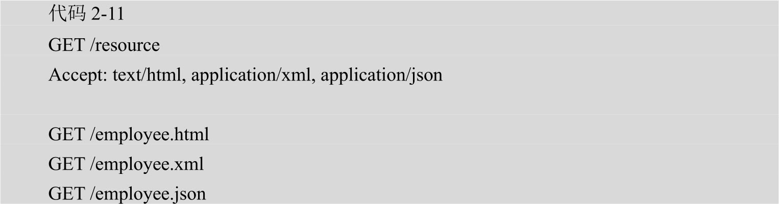 另外,需要注意的是,当一个资源有多个表述形式时,可以根据URI的后缀(扩展名)来选择特定的表述形式。如代码2-11所示,Accept语句指出了资源的三种表述形式,然后在GET语句中可以通过不同的文件扩展名来获取相应的资源表述形式。