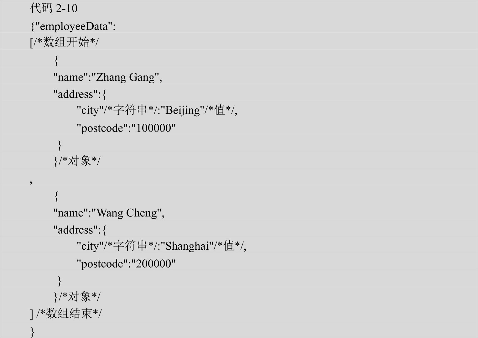 我们需要给每个会被访问的资源设计它的表述形式。常见的表述形式有HTML、XML和JSON等。JSON(JavaScript object notation)是一种轻量级的数据交换格式,独立于编程语言,易于阅读,同时易于机器解析和生成。代码2-10给出了JSON的一个示例。