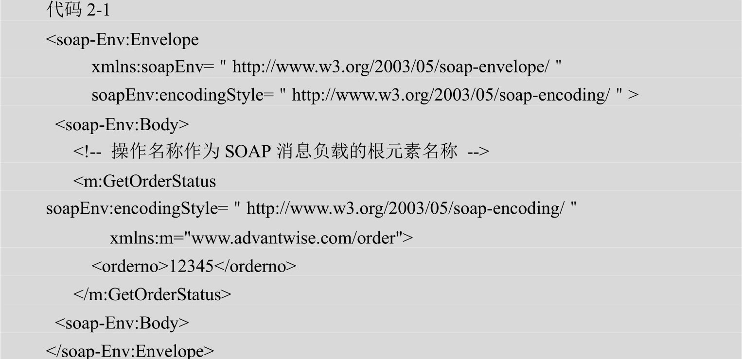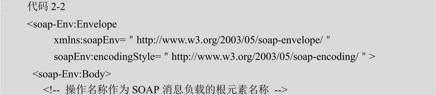 RPC风格的消息遵从SOAP标准,封装的是RPC调用的请求和返回消息,对该类消息的主要约束是必须把操作名称作为封装了对操作的调用请求和返回消息负载的根元素名称,如图2-5和代码2-1(RPC风格的调用请求消息)、代码2-2(RPC风格的返回消息)所示。一般RPC风格的消息可以由SOAP工具自动产生。而由文档风格的消息封装的XML文档可以是消息发送方和消息接收方约定的任意格式。