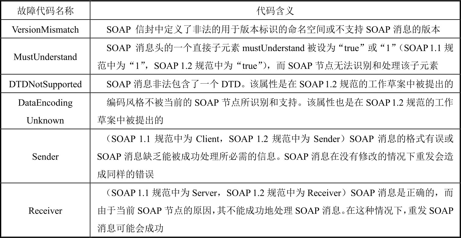 表2-1 SOAP 1.2规范中的故障代码及其含义