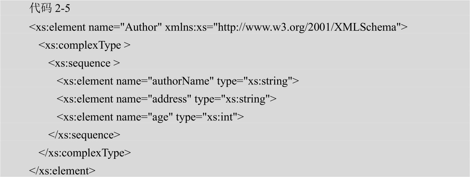 在结构类型中,允许把不同类型的值混合在一起,但同一结构中的不同组成元素的名称必须是唯一的。SOAP编码把结构映射为XML Schema复合类型,如代码2-5所示。