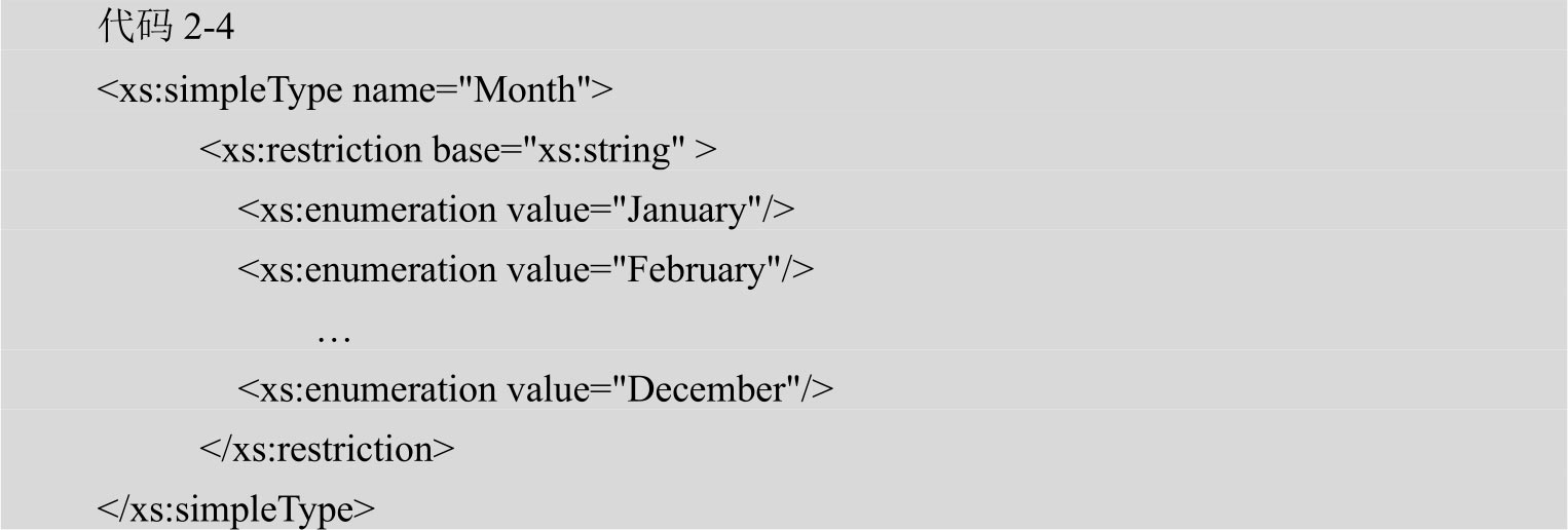 程序设计语言中的枚举类型直接对应XML Schema中的枚举类型。代码2-4给出的是Month枚举类型。