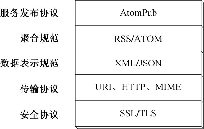 REST服务具有很多优点。首先,它简洁、高效,正确使用了成熟的网络协议(如HTTP),充分利用了已有的互联网基础设施。如图2-7所示为REST服务的常见协议栈。从图中可以看出,REST服务使用的协议大多是常见的互联网协议,如安全协议使用了SSL/TLS等;传输协议使用了URI、HTTP及MIME等;数据表示规范多用XML/JSON;聚合规范和服务发布协议分别选用RSS/ATOM和AtomPub等。其次,REST服务实现简单,对客户端实现要求较低,大多数情况下浏览器就足以胜任。最后,REST服务容易使用,降低了消费者使用服务的学习曲线,服务提供者对服务的维护成本也比较低。因此,REST服务获得了较高的支持率,包括Google在内的各大网站都已经开始提供REST服务。