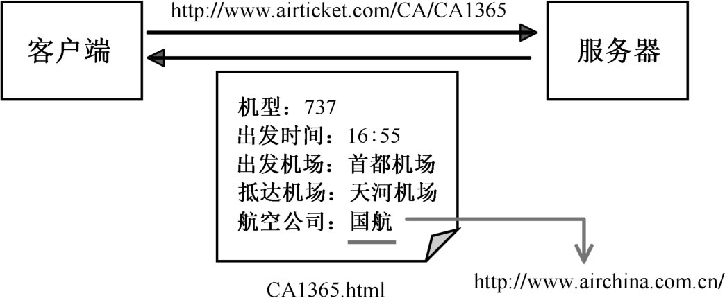 如图2-6所示,客户端通过URL“http://www.airticket.com/CA/CA1365”来请求航班CA1365这一资源。服务器以表述的形式返回这一资源的状态信息。图2-6所示的表述信息是CA1365.html,但需要注意的是,服务器可能会针对一个资源维护多种状态信息,如航班CA1365资源也可以采用XML形式表示。接收到航班CA1365资源的表述后,客户端将进入一个新的状态。此时,客户端可能会根据“航空公司”这一属性的链接“http://www.airchina.com.cn/”来进一步向服务器请求“国航”这一资源的表述信息。当接收到新的资源表述信息后,客户端又将转移到另一个新的状态。也就是说,客户端将根据每个资源的表述信息发生状态转移,这也就是所谓“表述性状态转移”的实质。
