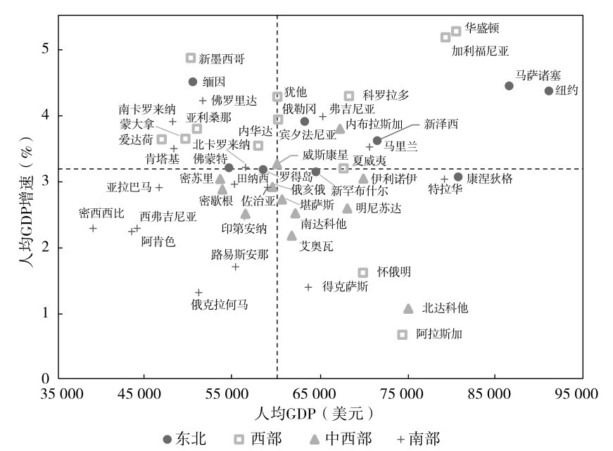 资料来源:各州人均GDP数据根据美国经济分析局公布的各州GDP(现价美元)和美国人口调查局公布的各州居民人口估计计算得出。