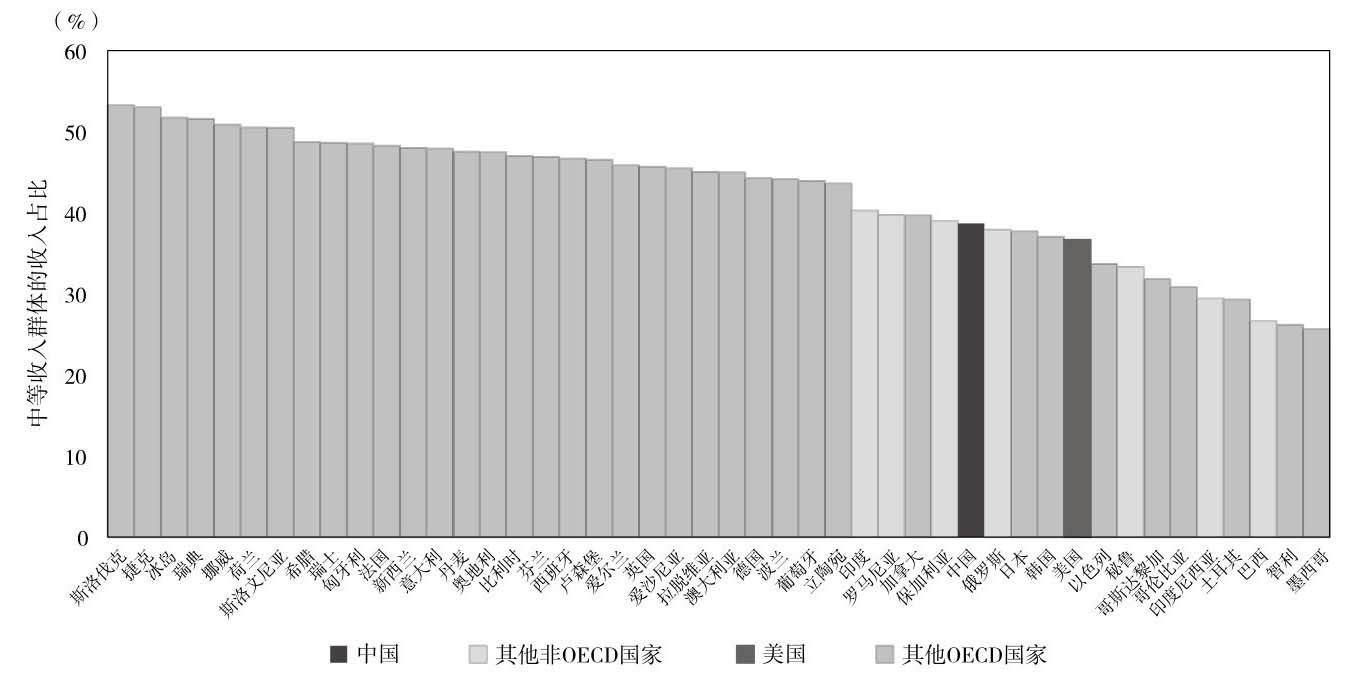 中等收入群体的收入占比为38.7%(见图2-4),低于瑞典(51.6%)、挪威(50.9%)、法国(48.3%)、英国(45.7%)、德国(44.3%)等绝大多数OECD国家。