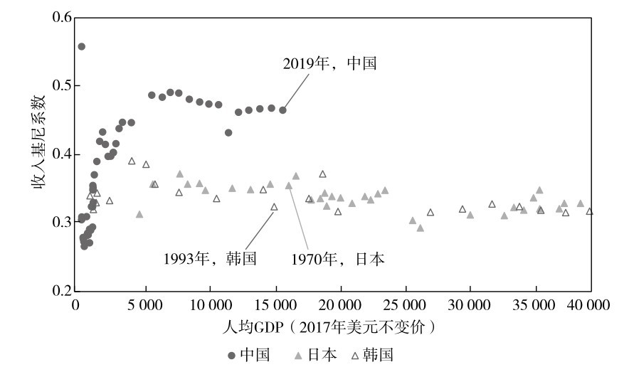 与美国和绝大多数欧洲国家相比,我国人均GDP水平更低,而收入基尼系数更高,呈现在更低富裕水平上的更严重不平等。而在亚洲经济体中,中国也是收入基尼系数较高的经济体之一(见图2-5)。比较日本和韩国的历史情况,两国在相当的人均GDP水平上收入基尼系数相近,人群差距与经济发展之间呈现类似的关联路径。而我国却在相当的人均GDP水平上呈现显著更高的收入基尼系数。尽管我国2019年人均GDP水平与1970年的日本、1993年的韩国相当,但我国的收入基尼系数却比日本高0.11,比韩国高0.14(见图2-6)。