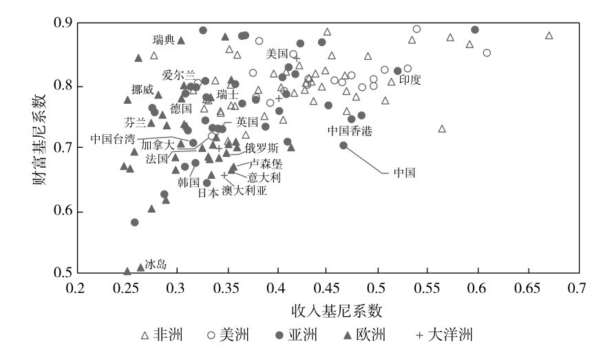 资料来源:横轴为2010—2019年各经济体收入基尼系数最新数据,数据来自UNU-WIDER,World Income Inequality Database;纵轴为2020年各经济体财富基尼系数,数据来自Credit Suisse Global Wealth Databook 2021。