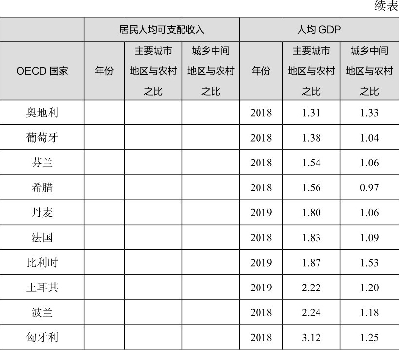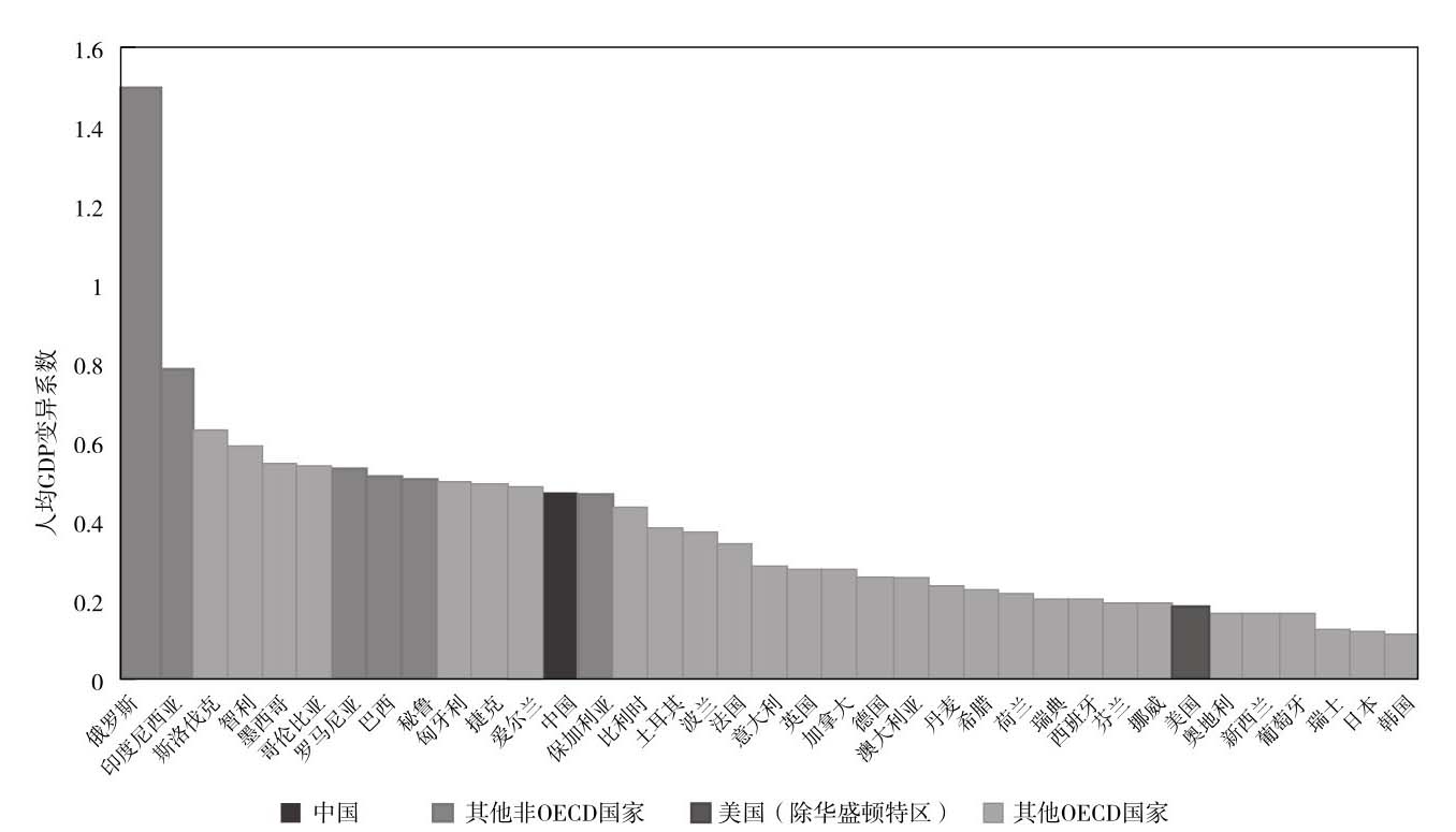 资料来源:中国和美国的各地区人均GDP变异系数根据图2-1和图2-2的2019年最新数据计算得出,其余经济体各地区人均GDP变异系数根据OECD.Stat给出的2017—2019年最新地区人均GDP(现价美元,购买力平价)计算得出。