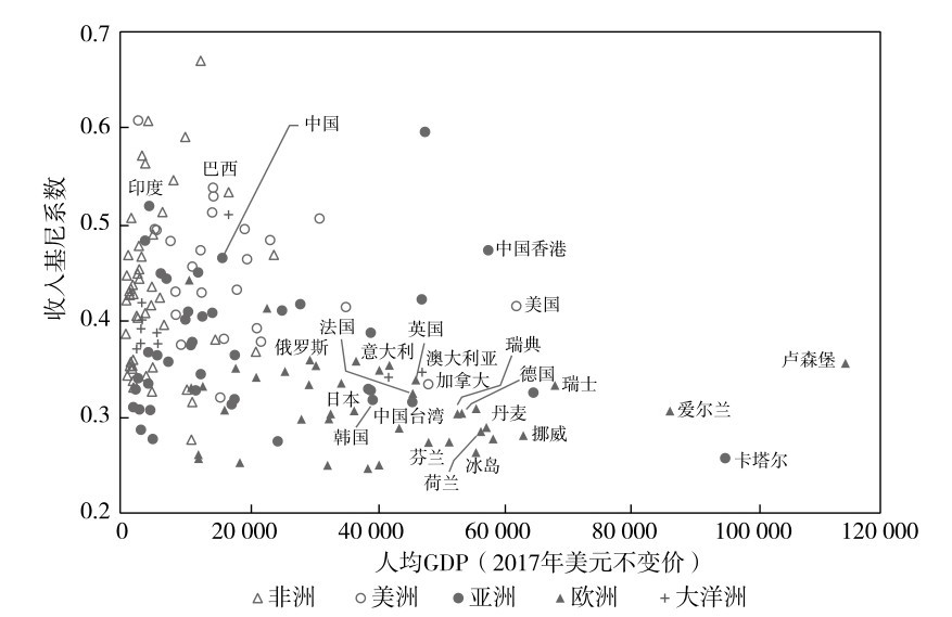 图2-5 世界主要经济体收入基尼系数与人均GDP的关系