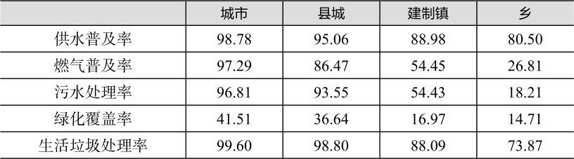 同时,我国城乡基础设施建设和公共卫生服务差距仍然明显。在基础设施方面,城市供水普及率为98.78%,燃气普及率为97.29%;县城供水普及率为95.06%,燃气普及率为86.47%;建制镇供水普及率为88.98%,燃气普及率为54.45%;乡供水普及率为80.50%,燃气普及率为26.81%(如表2-2所示)。在医疗卫生方面,根据国家统计局的数据,2019年我国城市和农村每万人医疗卫生机构床位数分别为87.81和48.09,每万人拥有城市和农村卫生技术人员数分别为111和50,城市人均床位数和卫生技术人员数约为农村的2倍。