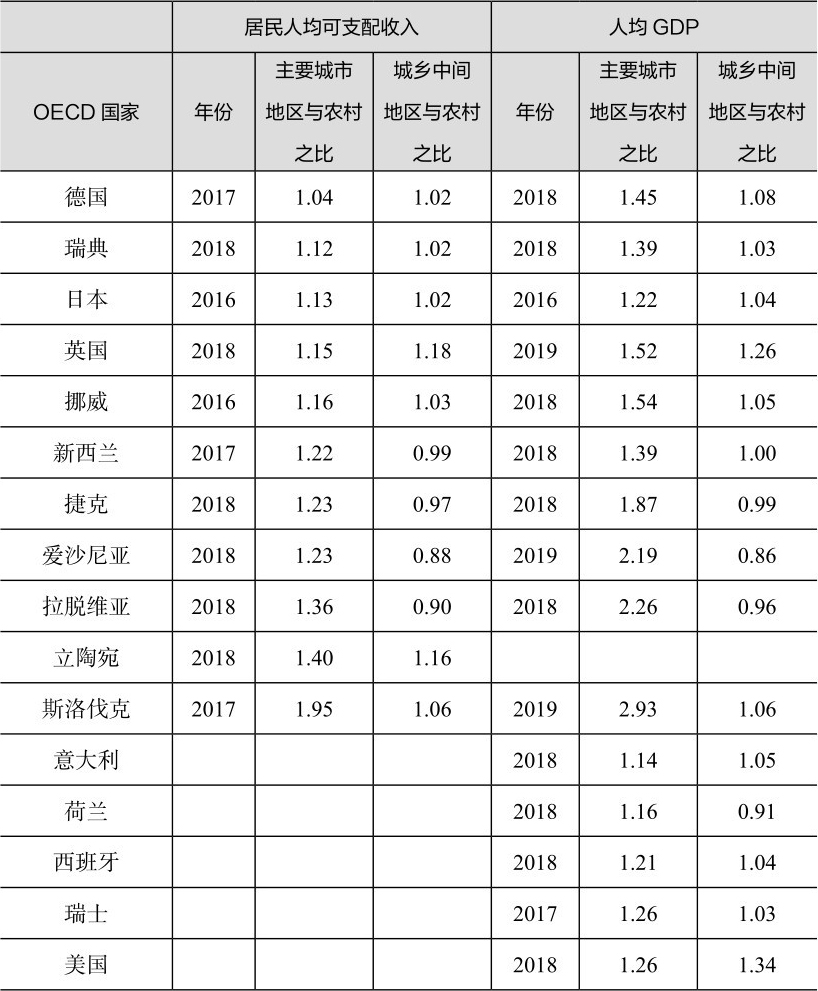 近年来城乡居民人均可支配收入比虽然有所下降,但至2019年仍高达2.64,并且与城乡人均消费支出比(2.11)之差持续扩大,可能带来城乡居民财富差距进一步扩大。2019年,我国城镇和农村居民家庭恩格尔系数分别为27.6%和30.0%,这一系数差异同样反映了我国城乡经济发展水平存在差距。国际比较而言(见表2-1),德国主要城市地区(城乡中间地区)与农村地区居民人均可支配收入比为1.04(1.02),日本主要城市地区(城乡中间地区)与农村地区居民人均可支配收入比为1.13(1.02),美国主要城市地区(城乡中间地区)与农村地区居民人均GDP之比为1.26(1.34),因此,我国城乡差距显著高于这些世界主要经济体。