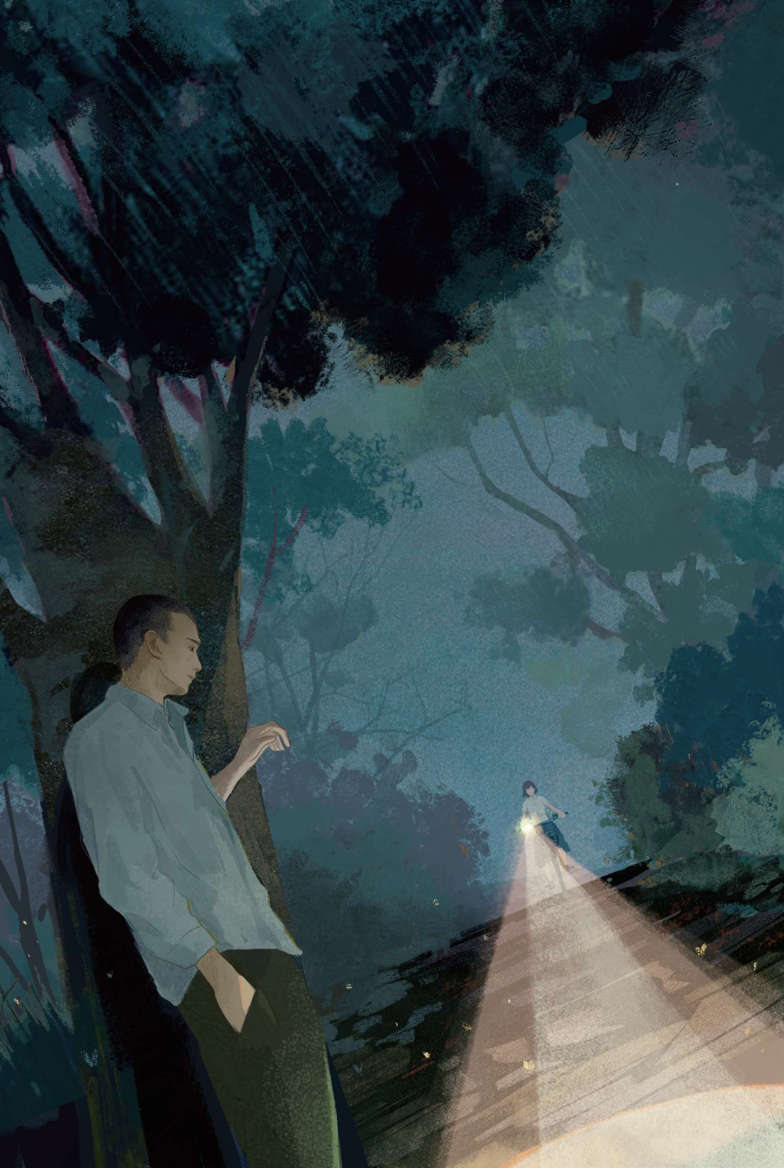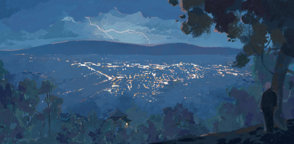 请让我心中的邪恶繁殖,无穷无尽地繁殖,绽放光彩,和眼前这些无数的灯一一对应起来吧!请让包容邪恶的我心中的黑暗,变得和这包容无数灯火的夜的黑暗一模一样吧!