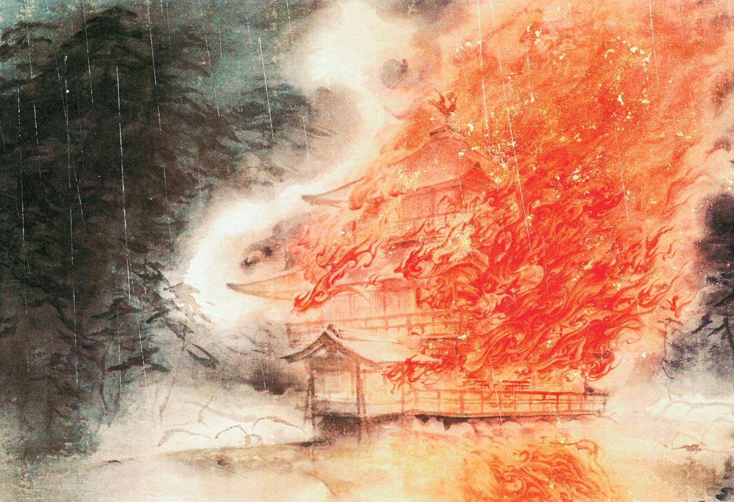 日本近代著名画家川端龙子(1885—1966)根据金阁寺纵火事件所作,于事件发生两个月后展出。