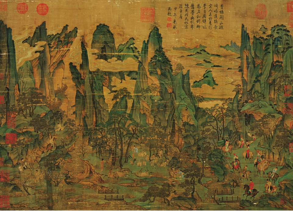 《明皇幸蜀图》,唐李昭道(一说李思训)绘。此图描绘的是安禄山发动叛乱后,玄宗赴蜀避难途中的场景