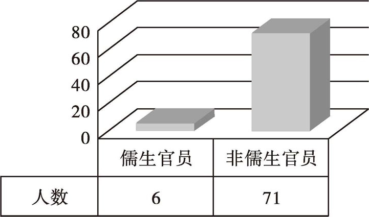 结果,在汉武帝54年统治期间,77位身居要职的高官中只有6人(7.8%)被司马迁和班固称为儒生。(见图1.4)显然,儒生只是权力的金字塔上层几个落落寡合之人。这一发现促使我们不得不问一声,武帝所谓奖掖儒学是否有事实的基础。