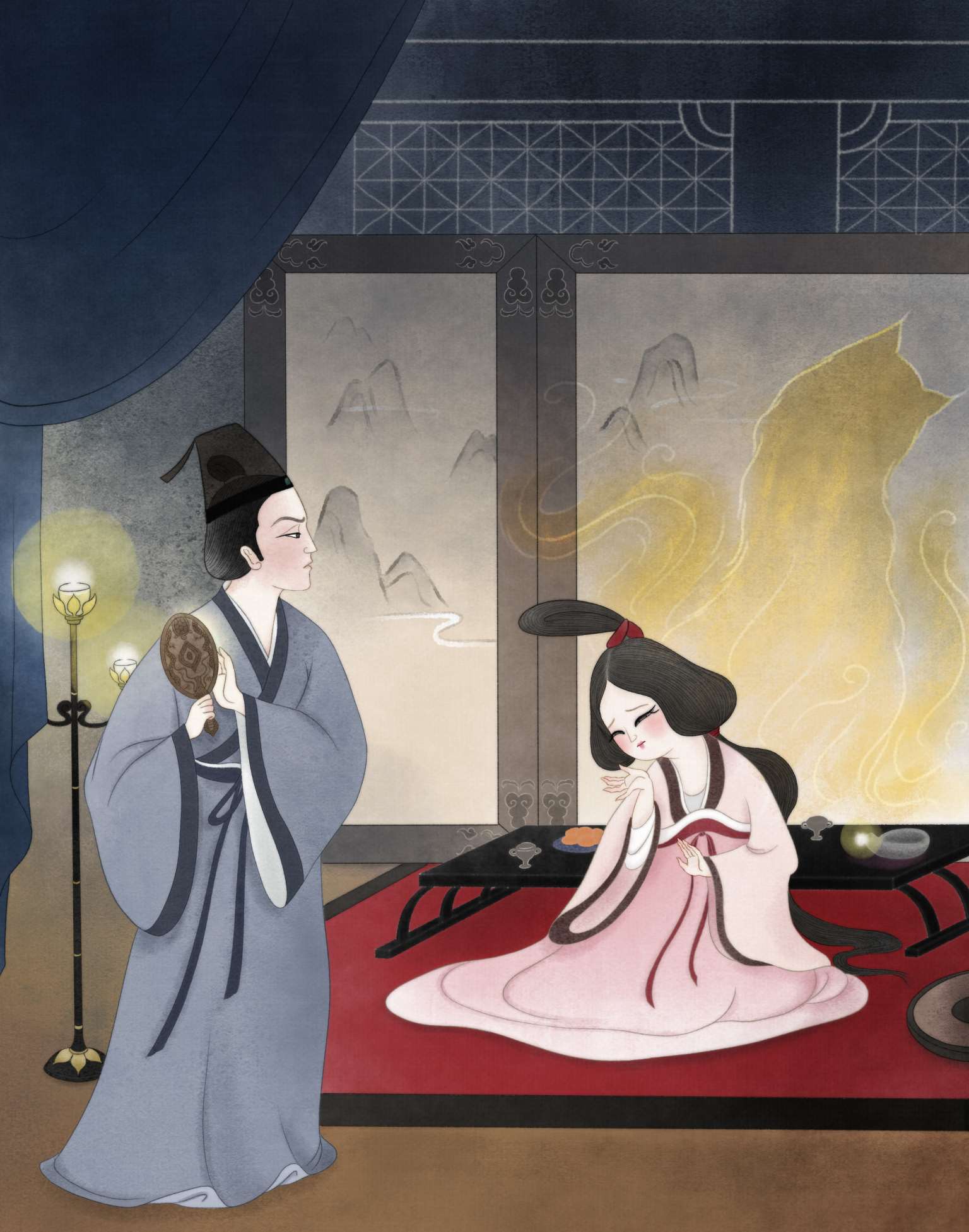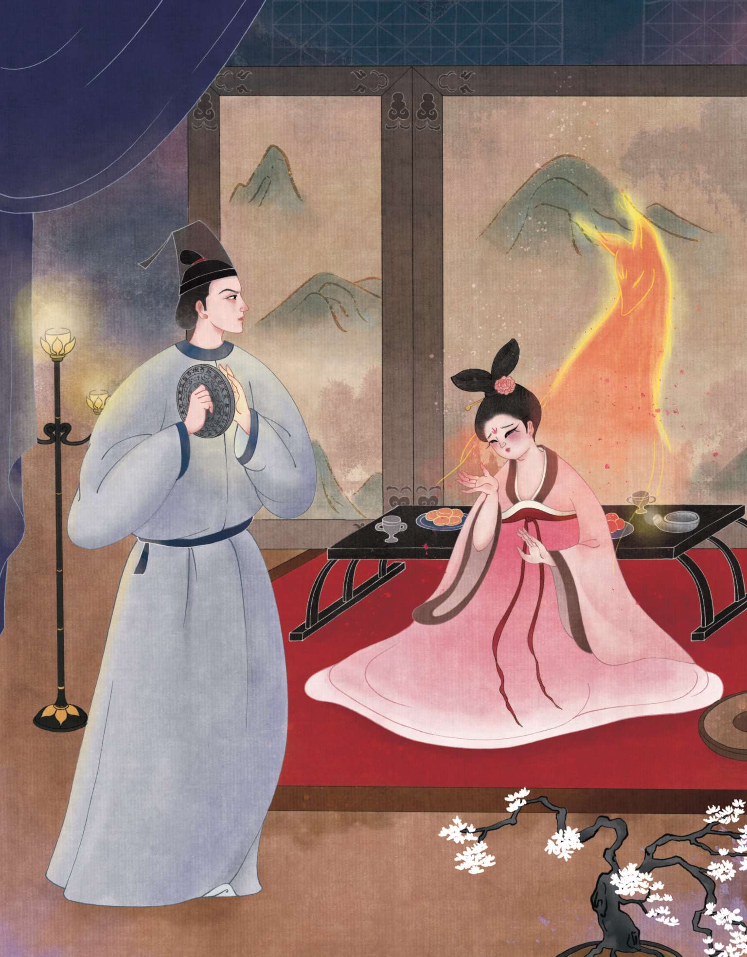 大业七年五月,我被罢免御史之职,回到河东,恰好遇上侯生离世,因而得到了这面宝镜。同年六月,我回长安,途经长乐坡,借宿在程雄家里。程雄家新近接受了一名婢女的寄宿。她长得端庄秀丽,名叫鹦鹉。我放下行装,准备整理一下衣冠,便取出古镜照了照。不料,鹦鹉在远处看到镜面,马上伏地叩首,血流不止,不住念道:“再也不敢住在这里了。”我感到十分惊奇,就请来程雄问个清楚。程雄说:“两个月前,有位客人带着这婢女从东面来,当时她病得很厉害,客人便将她寄留在这儿,并说:‘我回来时再把她带走。’但他至今也没再来,因此我也不太清楚她是什么来历。”我疑心她是妖精,便手持镜子向她逼近。她立刻惊叫道:“饶命啊,我马上现出原形。”我随即遮住镜子,说:“你先如实交代自己的来历,再现出原形,我当饶你性命。”那婢女再次叩拜,自述道:“我本是华山府君庙前大松树下的千年狐狸,只因我时常变幻成女子的模样,大肆诱惑男子,罪该处死,遂遭到府君的追捕。我逃到黄河、渭水一带,当了下邽陈思恭的干女儿。思恭的妻子郑氏待我很好,后来把我嫁给同乡柴华。我与柴华感情不睦,就往东边逃,经过韩城县,被路人李无傲捉住。李无傲是个粗暴的汉子,挟持着我在外游荡了好几年,前些时候跟着他到了这里,他就将我丢下走了。不承想在这里会遇到宝镜,使我无处遁形。”我又问她:“你本是狐狸,幻化成人,难道会不害人吗?”婢女答:“我幻化成人形,侍奉他人,并没有害过人。不过我逃避府君的追捕,变幻形象骗人,为神道所憎恶,自然是该死的。”我听完,又对她说:“我放你一条生路如何?”鹦鹉说:“承蒙恩公厚爱,小女子感激不尽,但被宝镜一照,就不能再遁形逃脱了。只是幻化成人形已久,羞于再恢复原形,希望您能把镜子收回到匣里,准许我在临死前,一醉方休。”我又问:“我收了宝镜,你不会逃跑吗?”鹦鹉笑答:“恩公刚才还答应要放过我,我何必等您收了镜子再逃走,那岂不是辜负了您的恩德?更何况经宝镜一照,我已无路可逃了,只希望在余下的短暂生命里,尽情地享受人生最后的欢愉。”我马上把宝镜放回匣中,又代她叫来了酒菜,请来了程雄的家人和街坊邻里,一起畅饮谈笑。不一会儿,婢女就喝得酩酊大醉,只见她挥起衣袖,翩翩起舞,边舞边唱道:“宝镜宝镜,哀哉予命!自我离形,于今几姓?生虽可乐,死必不伤。何为眷恋,守此一方!”唱完,她又向我叩头,随即化为狐狸而死。在座的人无不为之惊异、叹息。