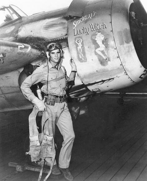“甘比尔湾”号上的飞行员与他的“野猫”战斗机。虽然“甘比尔湾”被击沉,但飞行员仍可驾机作战,他们的英勇表现挽救了“塔菲-三”。