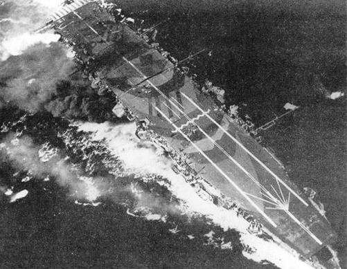 恩加诺海海战场景:规避中的“瑞凤”,注意甲板上绘有战列舰轮廓的伪装图案。此时甲板上已经空空如也,升降机前后都中了弹,右舷尾部则在冒着浓烟。