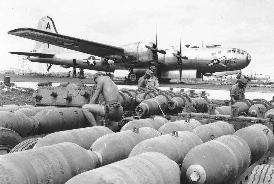 正在等待装弹的B-29轰炸机。B-29不仅是“二战”时各国空军中最大型的飞机,同时也是当时集各种新科技于一身的最先进武器之一。它可以在四万英尺高度进行高速飞行,当时轴心国的大部分战斗机都很难爬升至这种高度,就算勉强能爬上去,也追不上B-29的速度。