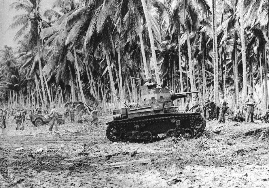 在岛上纵横驰骋的M2A4轻型坦克。这种坦克的原型是英国的维克斯坦克,火力和装甲厚度都一般,但用来对付步兵还是够资格的。