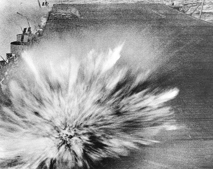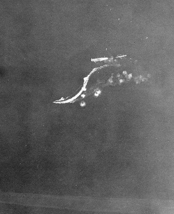 “企业”被一枚两百五十公斤炸弹击中瞬间。由随舰海军记者所拍摄,记者在拍摄完这张照片后也被炸身亡。